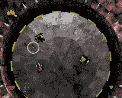 At the start of the game you set up the players' controls, human or computer, and the computer's skill level. You can also alter the controls for the human players to your preference for weapons firing and acceleration. You then select your car from the four which come with the game. There are two types of game, tournament and knockout. In tournament you battle for eight rounds over four randomly chosen arenas while in knockout you can choose the arena you will battle on and how many battles will take place, from 4, 8, 12, or infinity.