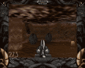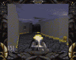 What you can't see in the screen shots is the fact that on my 50MHz 68030 with 16MB of Fast RAM this game is super smooth. It is easily the smoothest animation of any texture-mapped dungeon game I have ever played on my 1200. The enemy intelligence has not yet been completed so playing this demo is limited. It does also show off the lighting effects. You can see some on the right hand screen shot above. Your shots produce flashes of light on both the gun and the walls around you.