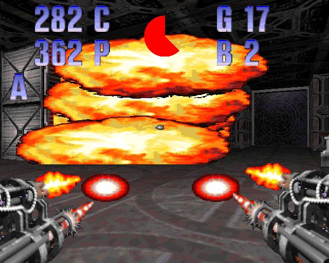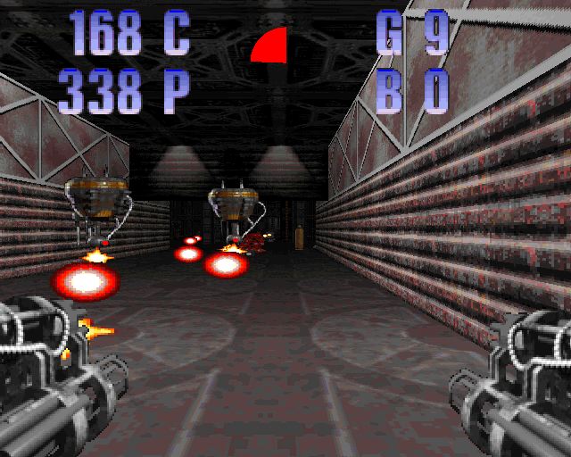 The level design itself is mostly quite pedestrian. The first seven levels are for practice, and while not entirely lacking in charm, they have little to recommend them against games with a superior engine. The gameplay is very easy in these early levels as well, and even though three difficulty settings (Normal, Hard and Impossible) are offered, I saw very little difference between them. However, the designers began to cheat, making the levels harder by hiding necessary powerups behind secret doors. Most of these are nearly impossible to find since there's no visual cue, such as a texture offset or lighting variance, to betray them.