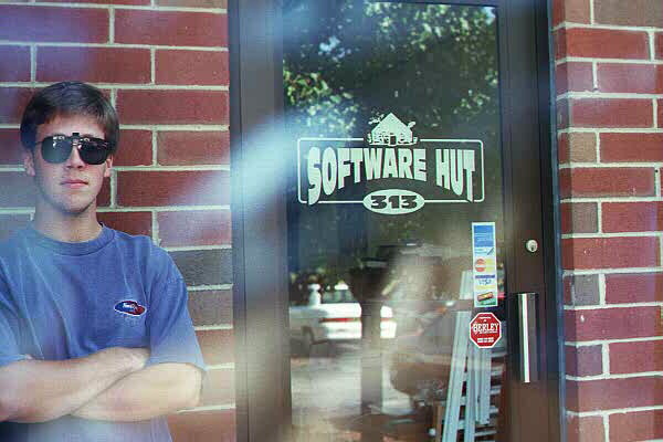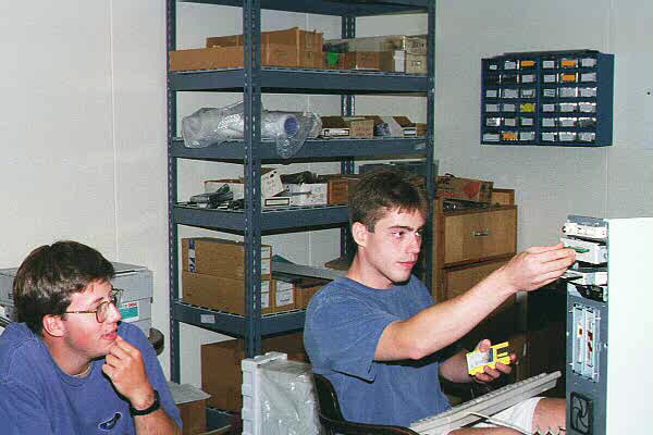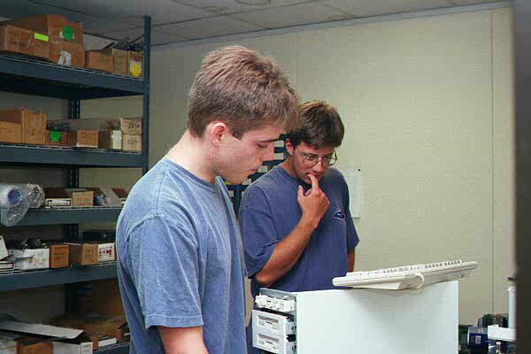 Software Hut turned out to be located in a giant cement pond full of cement cubicles with numbers on their doors, with barely a tree or shrubbery to shade the car which I couldn't park anyway (all spots taken, so I "perpendicular-parked" (Editor's Note: And I just took my road test last week. Aren't you glad I'm learning from the best) next to Software Hut employee vehicles) and there...on the door...same numbers that are indelibly stamped on the back of the Tower, the date of manufacture: 313 (Henderson Drive) (1997). Spooky, huh? We walked in like something the Philadelphia city workers scraped off the pavement (hey, long trip) and immediately met Anthony ("Big Red," "Ant") who to his credit did not call the police to eject us from the premises (it didn't hurt that we immediately identified ourselves). We extracted The Beastie from the car and gave ourselves up to the air conditioning within. The ambience was friendly and comfortable, and a welcome relief from the blistering heat without.